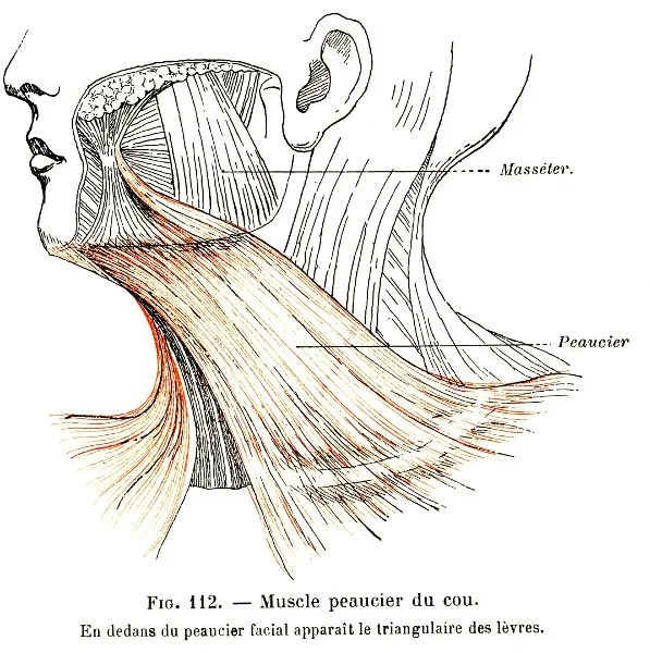 Stretching: The platysma is a great flat muscle that extends from your chin, over your neck and down to your clavicles. This is the muscle that pops out when you extend your lower jaw with exaggeration.