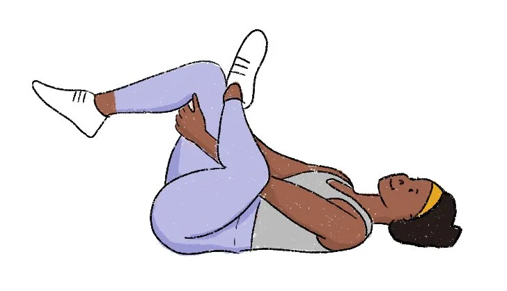Then, move into a figure-4 stretch: Cross your left ankle over your right thigh and bend your right knee until your calf is parallel to the ground. Next, interlace your fingers behind your right thigh and gently pull in toward your chest, rocking gently if you like. Repeat on the other side (see illustration below from hip flexor stretches). As you rest here, you might bring yesterday's queries to mind.