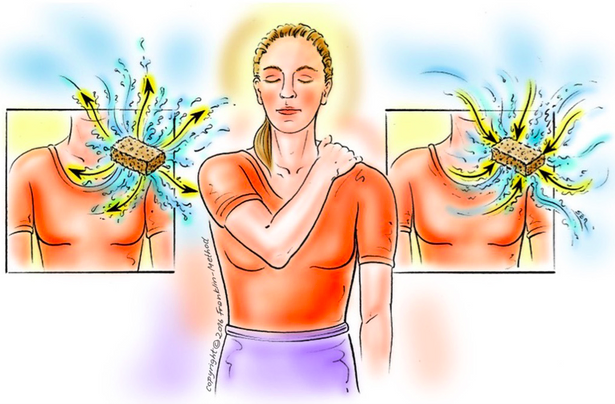 Move into visualization using the Franklin method: raise and squeeze one shoulder as though squeezing out a sponge full of water, then lower the shoulder, imagining the sponge refilling with water (3-minute video for a demo).
